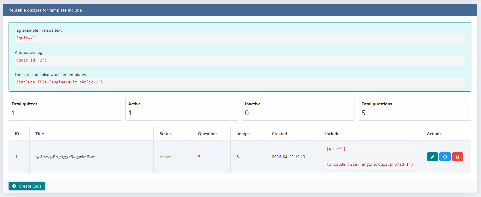 ამ პლაგინით შეგიძლია შექმნა საინტერესო ქვიზები სურათებით, მრავალვარიანტიანი პასუხებით და დეტალური ახსნებით. თითოეული ქვიზი შესაძლებელია მარტივად ჩასვა საიტის ნებისმიერ გვერდზე include-ის გამოყენებით.